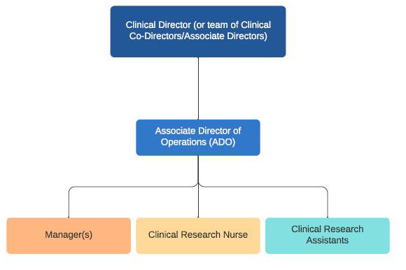 In 2012, CSP also established a consortium of ten VA medical centers (VAMCs) called the Network of Dedicated Enrollment Sites (NODES) that offers innovative approaches in addressing challenges to clinical trial execution (Condon et al., 2017; Johnson et al., 2018; Velarde et al., 2018; Bakaeen et al., 2014). Each Node site is led by a Clinical Director (or team of Clinical Co-/Associate Directors), an Associate Director-Operations (ADO), and other clinical research support staff, e.g. Managers, Clinical Research Nurses, and Clinical Research Assistants (Figure 1). Brief descriptions of these roles can be found in Appendix A. The CSP infrastructure offers support to VAMCs that participate in its clinical trials and studies in the form of the aforementioned support provided by the CSP Centers. NODES also provides an invaluable benefit to both the CSP Centers and the study sites by providing feedback and support as it relates to the numerous “site-level” operational challenges encountered during various phases of a clinical research study (Kutner et al., 2010; Institute of Medicine (US) Forum on Drug Discovery, Development, and Translation, 2010; Fogel, 2018).