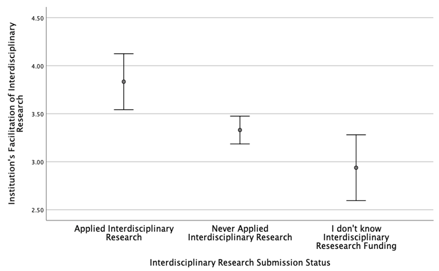 There were also no significant differences in willingness to collaborate between faculty who had been awarded a pilot interdisciplinary funding grant (M = 4.10, SD = .44, n = 26) and those who had not (M = 4.35, SD = .51, n = 8), F (1, 32) = 1.76, p = .19; this is presented in Figure 3. This indicates that faculty members who are not currently involved with a pilot interdisciplinary funding grant are nonetheless willing to engage in interdisciplinary collaborations.
