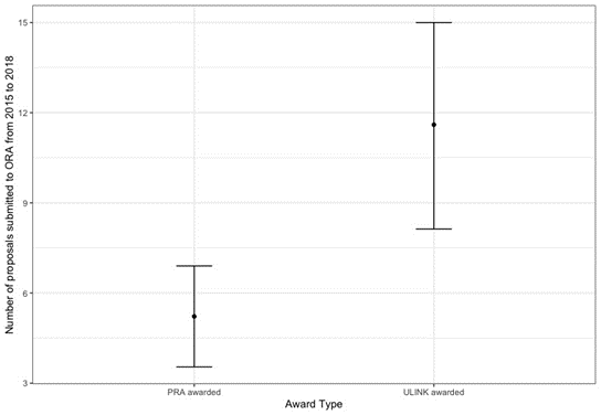 After adjusting for faculty academic rank, years of experience in the field and broader discipline, results from propensity score analysis (PSA) indicate that there was a significant difference in the average number of external grant proposals submitted through ORA between interdisciplinary pilot research funding awardees and other internal funding recipients. As shown in Figure 1, interdisciplinary pilot research funding awardees submitted significantly more grant proposals (n = 11.6) through ORA than other internal funding recipients (n = 5.2), t(37.84) = -3.42, p = .002, 95% CI: -10.09 to -2.58. This suggests that interdisciplinary pilot research funding awardees are more experienced with the process of applying for extramural grant funding when they enter the pilot interdisciplinary research funding program.