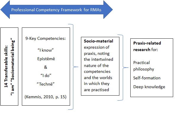 As a research aim, the study takes the form of a conceptual mapping of the ‘insider’ views of transferable skills included in a competency framework for RMA professionals (SARIMA, 2016) against an existing praxis framework (Kemmis, 2008, p. 21). We inquire into these soft skills, following praxis-related research (Kemmis, 2010), which is explained more fully in subsequent sections. Praxis-related research is used as both a methodology and theory for this exploration. While transferable skills have been conceptualized for different professions and for RMA, as provided by Derrick et al. (2014, p. 33-34), a review that makes specific philosophical-praxis linkages has not been covered to date. The article also contributes to praxis-related research within a specific profession, and its professionals (Derrick et al., 2014, p. 33-34), as opposed to a discipline (Kemmis, 2010).