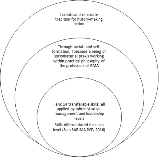 The practicing, and robust existence of transferable skills within frameworks for professions and RMA, points to sociomaterial praxis. Sociomateriality includes “the intimate entanglement of non-human and human elements in the construction of sociomaterial realities” (Hultin, 2019, p. 23) with “practices of knowing and being” as inseparable (Barad, 2007, p. 185). Therefore, knowing, doing and being, within a university system, are all mutually constitutive in living out the role of an RMA professional. Kemmis (2010), referencing Aristotle, and critiquing Flyvbjerg, highlights how knowledge and practice may be shaped by epistēmē (‘we know’: knowledge based on theory or contemplation) and techniquē (‘we do’: practical doing, technical craft). We state that transferable skills (‘we are’: interpersonal relational skills) are the sociomaterial expression of praxis, noting the intertwined nature of the socio-based competencies and the material worlds in which they are practiced.