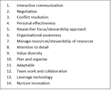 We posit that RMAs may, through the Framework and this study, become more conscious of the weight and significance of their transferable skills and therefore develop these more deliberately and/or use them with enhanced insight, knowing that soft skills are as much a part of their jobs as are their knowledge and expertise. They may usefully review the transferable skills in the SARIMA PCF and use the list to assist them to plan for their professional development, deliberately to demonstrate their solid value and worth to the university, to populate job specifications and CVs as well as to argue, if necessary, for deepened insights into why they hold a credible place within the organizational structure. Their stakeholders may also usefully recognize the same as they receive the RMA services and are recipients of RMA outcomes and impact.