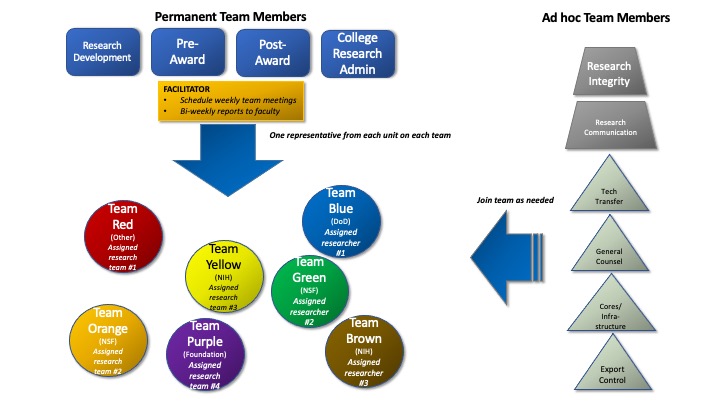 Figure 1. Outline of Team-Based Approach for Academic Research Administration. Teams consist of standing members from research and proposal development, pre- and post-award and a college administrator (if appropriate). Ad hoc members join the team, as needed. These can be representatives from compliance, tech transfer and other support units. Facilitators manage the team interactions and are the direct point of contact to faculty.