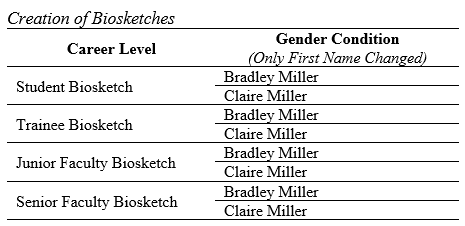 The applicant names were selected among the most common first and last names indicated in the 2020 Social Security Administration. The names were Bradley Miller (the male condition) and Claire Miller (the female condition). These names were pretested and validated in a similar recent publication (Eaton et al., 2020). The biosketches differed across each of the four career ranks (to reflect the given level) but were identical across candidate gender at each level, with the exception of the candidate’s first name (Table 1).