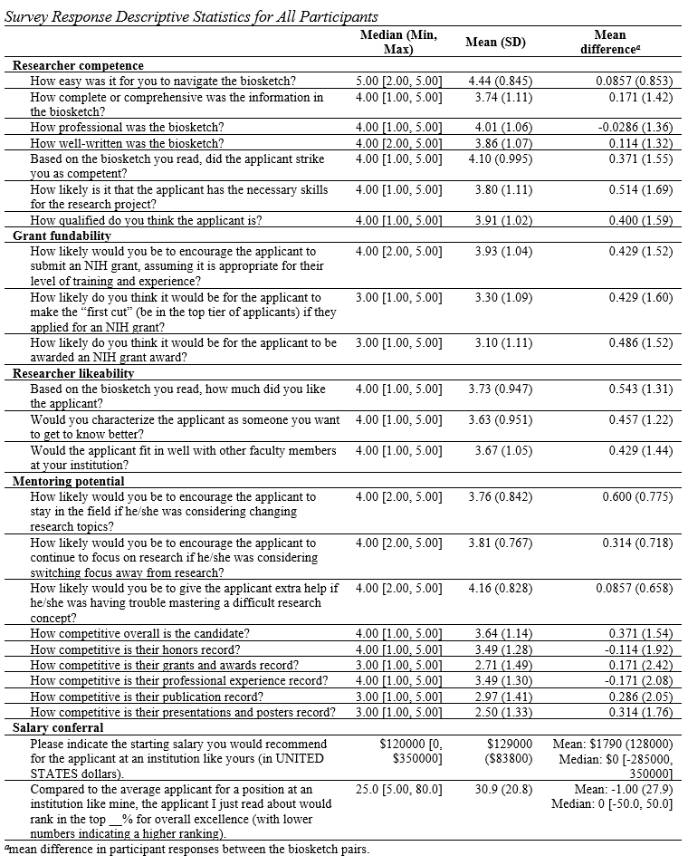 Contrary to previous research examining academic gender biases, we predicted that female and male applicants, overall, would be rated similarly in competence given that our study surveyed a female-dominated research administrator workforce (Hypothesis 1). Based on research on descriptive stereotypes, we also predicted that female candidates would be seen as more likable (researcher collegiality) and would be rated higher for mentoring potential than male candidates, as these traits may be perceived as communal and more typical of women than men (Hypothesis 2). Furthermore, consistent with prior research, we predicted that those in the senior career rank applicants would be more highly rated for research competence and skill (Hypothesis 3). Although we did not have any other formal hypotheses, we also assessed biosketch design and comprehension, and expected that senior career rank applicants would likely be more highly rated for biosketch design and comprehension due to competence in the field.