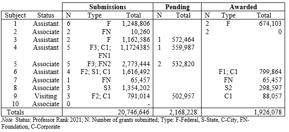 All participants have terminal degrees with nine having a PhD and one MFA. Six of the participants had less than five years of experience in higher education, two had six to ten years, and two had 11-25 years. Three participants had grant writing experience prior to working in higher education and seven had experience working on funded projects secured by other investigators. Three had applied for grants while on the tenure track and of the three, one had previous grant writing and work experience, one had work experience, and one had no prior experience.