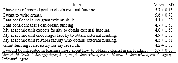 Interestingly, the attitudes about obtaining funding average between “neutral” and “somewhat agree.” The attitudes of self-motivation for gaining funding are at the highest level of agreement, while confidence, academic unit expectations, and necessity of grant funding ranked mostly neutral. This indicates that perceived benefits and rewards of obtaining funding are high, despite confidence and academic unit expectations ranking low. Therefore, internal motivation and/or attitudes and behaviors outside of one’s academic unit may play as much of a role in funding seeking behavior as compared to attitudes and behaviors within one’s academic unit.