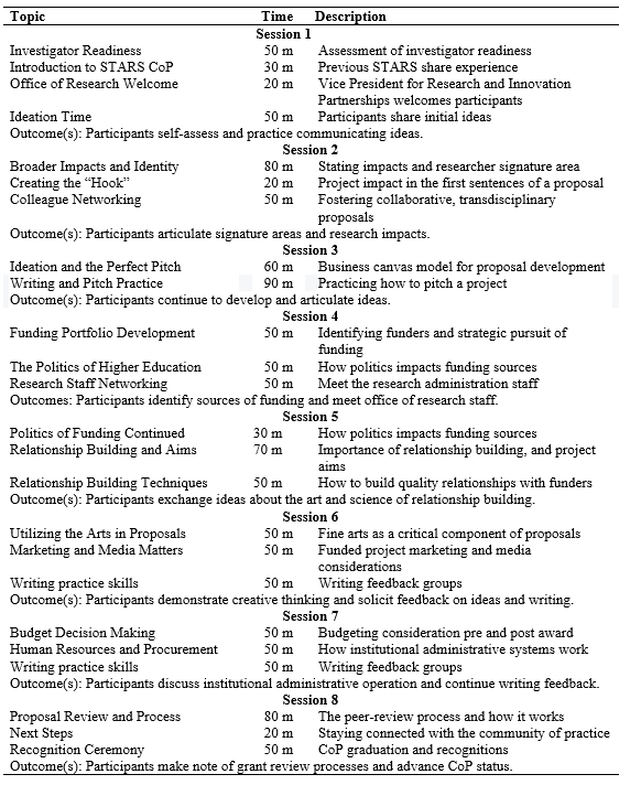 STARS faculty academy academic year cohort, CoP participants, agree to attend eight sessions over the course of one academic year. The sessions are prescheduled on selected Fridays from 10 am to 1 pm six months to one year in advance to allow interested participants to integrate the sessions into their schedules (See topics, duration, experience, and outcomes illustrated in Table 1).
