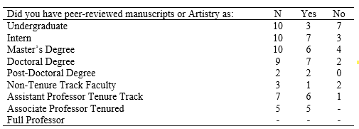 Other data collected from participants include peer-review publishing and artistry, attitudes towards funding behaviors, and funding behavior progression. Tables 2, 3, and 4 report the data.