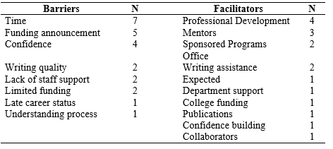 Faculty were asked to openly share what they believe to be their barriers and facilitators to positioning for funding. Not surprising, the most frequent barrier and facilitator is time. Faculty positioning for funding will require time, but this must also be balanced with institutional, college, and unit priorities for faculty members. For units that do not have expectations for faculty to gain funding, faculty maybe less motivated to position for funding or participate on transdisciplinary proposals. They also may not feel supported in their positioning for funding endeavors.