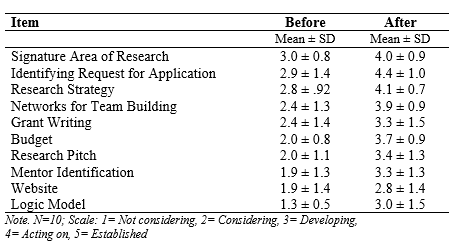 Grant writing, budget, research pitch, and mentor identification remain mid-level areas of development pre- and post- faculty academy. The budget, research pitch, and mentor identification have greater movement on the behavioral continuum than grant writing from pre- to post- academy. This is perhaps because the academy placed more emphasis on grant planning than grant writing as an initial phase to positioning for funding. The outcome is not a surprise since the academy focuses on encouraging faculty to spend more time in ideation and planning phases prior to proposal writing. Post- faculty academy, the academy encourages faculty to continue with other professional development activities to practice and sharpen their proposal writing skills.