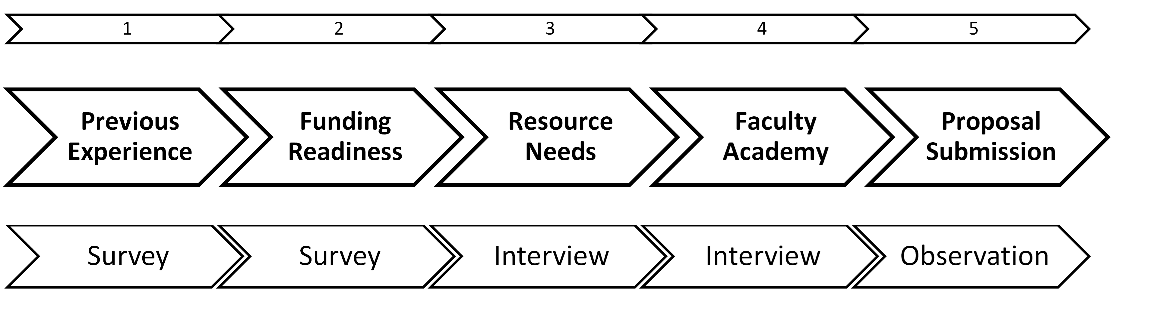 This study evaluated one faculty cohort (N=10) to gauge: 1) experience and training in faculty units and needed development, education, and direction required, 2) funding readiness, 3) resource needs, 4) experience with an eight-session faculty academy over the course of one academic year, and 5) proposal progression over the course of an eighteen-month period. The study employed an exploratory case study design (Yin, 2018) in a phased approach (See Figure 1). Pre-academy assessment occurred using research designed surveys which queried 1) previous experience with grants and funding and 2) Faculty Assessment for Readiness (FAIR). Post-academy assessments included interviews regarding 3) resource needs, and 4) satisfaction with the academy experience. Participant observations were maintained over the course of an eighteen-month period to track progress in positioning for funding, grant submissions, and funding outcomes.