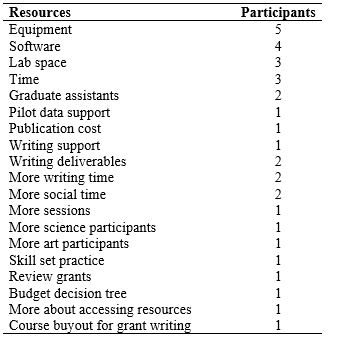 Equipment, software, lab space, time, and graduate assistants are the most frequently reported by the participants as resource needs. Interesting to note, time is the only need that is also mentioned as a barrier. Equipment, software, lab space, and graduate assistants do not appear as barriers or facilitators. As with barriers and facilitators, needs can be addressed with context-specific coaching using discipline-specific and other mentors, including administrators. Determining if needs are real or perceived is essential as is determining how the needs can be most efficient and effective using institutional and other resources.