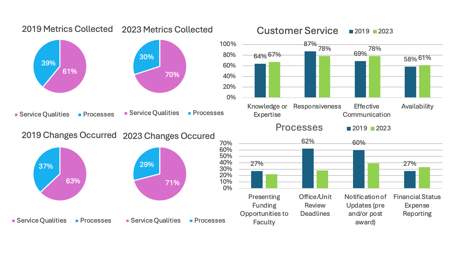 Comparing 2019 to 2023 metric collection and changes as a result from collection for both common research administration service qualities and processes.