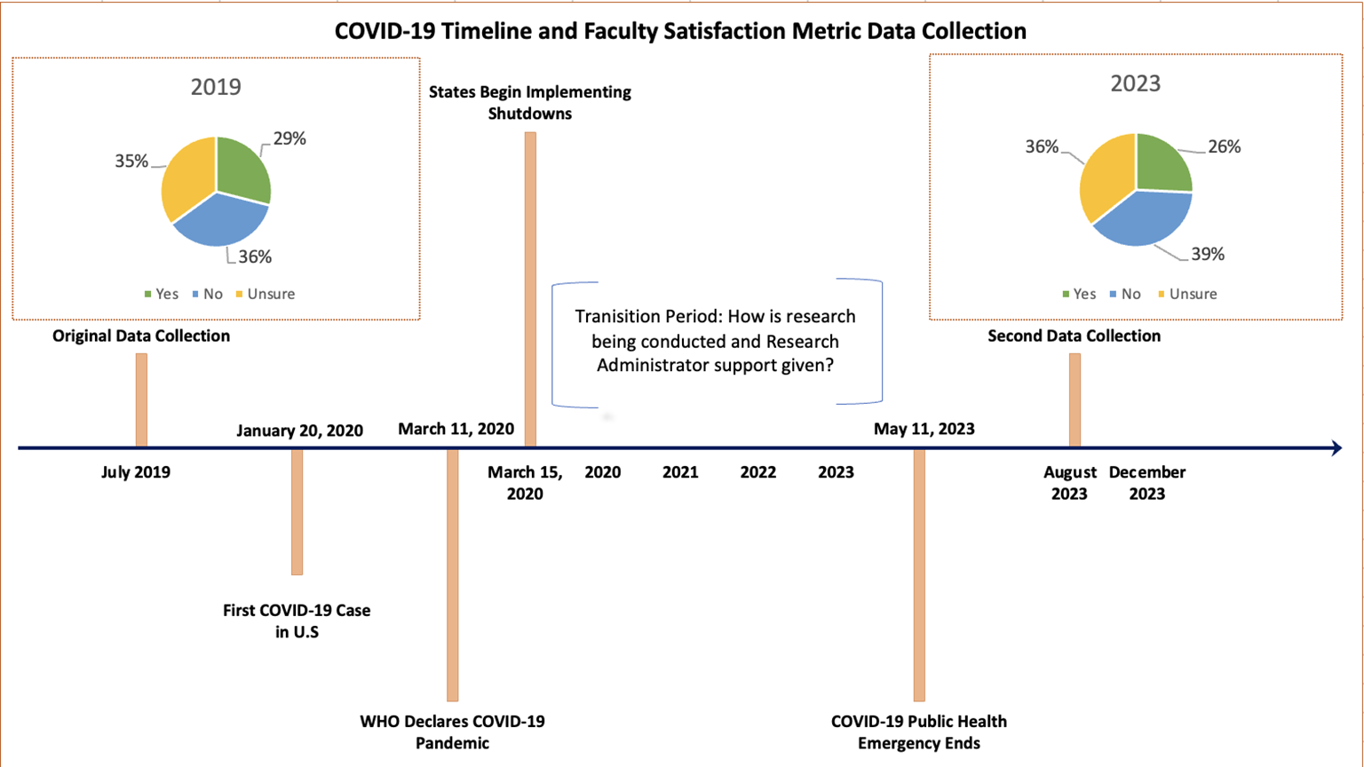 In 2019 as part of a master’s thesis for the lead author, data was collected on if faculty satisfaction metrics were collected in institutes of higher education (IHEs) research administration offices and if the metrics were used to make changes to processes and customer services those offices initiate (Bui, 2019). Since this data was collected, the COVID-19 pandemic occurred and significantly altered how research administration offices at IHEs function. For this study the COVID-19 pandemic is defined based on when it was officially declared a pandemic by the CDC on March 11, 2020, and ending May 11, 2023, when the COVID-19 Public Health Emergency declaration ended (David J. Sencer CDC Museum, 2023; CDC, 2023). During these 3 years and 2 months, research and research administration was forced to adapt, transform, and consider permanent changes as safety became the priority while trying to maintain productivity for RAs and researchers.