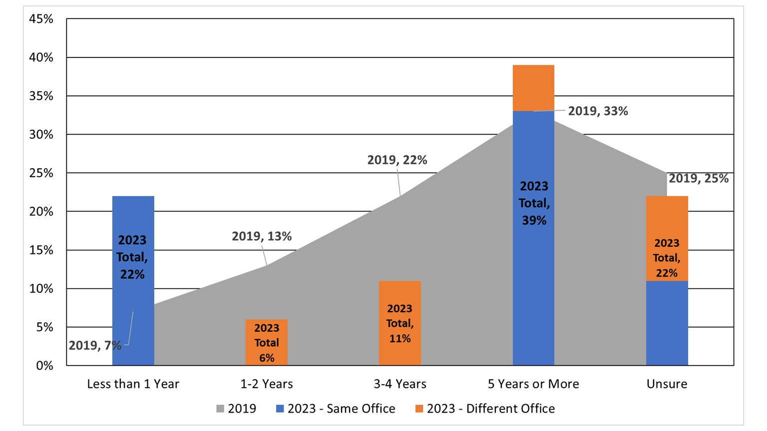 Respondents who answered yes to collecting faculty satisfaction metrics both in 2019 and 2023 were asked about the length of time their office has collected faculty satisfaction metrics and Figure 2 highlights the comparisons between data sets.