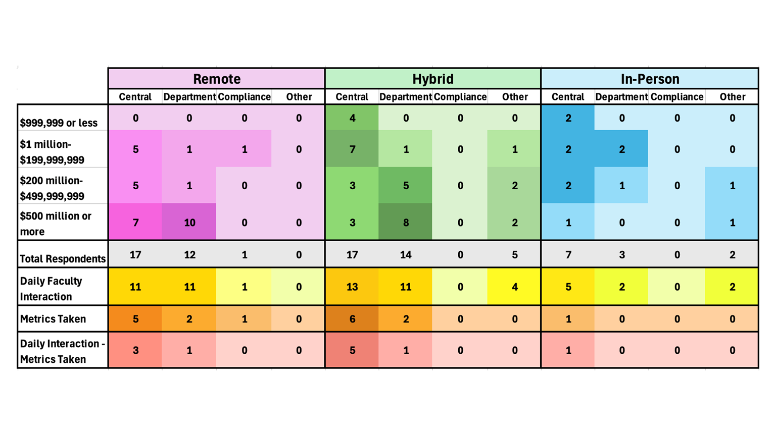 The data collected from the survey demonstrated a transition to remote work for RAs in IHE which was an assumption with the onset of COVID-19; however, it also depicts a potentially long-lasting transition with the majority of respondents working remotely either fully or in a hybrid structure. Respondents were also asked additional questions about the demographics of their IHE and their research administration position. Figure 6 outlines respondents based on work environment, type of research administration office, the size of their IHE based on research expenditures, if there is daily interaction with faculty (PI), and those that collect metrics and have daily interactions with PI. Majority of respondents were from larger IHE and worked fully remote or hybrid. Of the respondents who work remote and hybrid, they mostly come from central and department offices where a large number of respondents have daily interaction with faculty. For example, there were 17 respondents who work fully remote in central offices and of those, 11 of them have daily PI interaction and 5 collect metrics. Of the 11 that have daily PI interactions, 3 of them also collect metrics. As shown in Figure 6, there is a higher rate of faculty satisfaction metrics collected for those who have positions that are either fully remote or hybrid compared to those who work 100% on-site. COVID-19 forced the transition to remote work, but it is encouraging to see lasting changes to RA work environments even when those RA positions require consistent and frequent customer service to faculty, alluding to successful support from RAs regardless of where that support is being provided. Overall, remote and hybrid work is prevalent across different types of RA offices and IHE sizes but may be more common in central and department research administration offices within IHE with larger amounts of annual research expenditures. These observable increases in remote and hybrid positions have also shown a clear pattern of increased faculty satisfaction metric collection with 16:1 (remote+hybrid:in-person) in general and a 10:1 ratio for those who have daily interactions with PIs. As remote and hybrid options continue to remain for RA positions, the need to balance those positions with faculty satisfaction compared to those with in-person positions will also remain an important evaluation criteria moving forward.