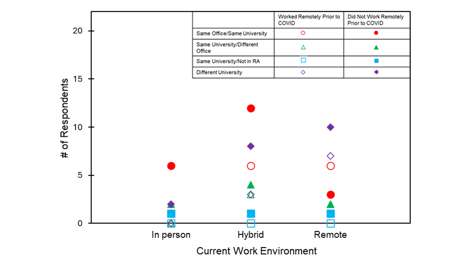 While faculty faced numerous challenges during the pandemic and mandatory shutdowns beyond what’s mentioned above, RAs experienced similar challenges adapting to remote work and trying to assist faculty during a period of unknown and confusion. One study by National Council of University Research Administrators (NCURA) found in 2021 that just over 600 respondents at public institutes were working remotely out of the total 1618 responses from across multiple types of institutes (Madnick et al., n.d.). Despite this study, there are limited resources available to quantify IHE RA remote work during COVID, but there are studies based on United States employees and those in higher education to deduce the majority of university RAs transitioned to remote work during the height of the pandemic. According to telecommuting statistics, before the pandemic, less than 5% of the U.S. employee workforce worked at home three or more days a week, but during the peak of the pandemic when stay at home regulations were in place, 60% of employees were able to successfully work from home (Global Workplace Analytics, n.d.-b). The Bureau of Labor Statistics (BLS) categorizes compatible jobs with remote work as those with professional specialties, technical support, administrative support, and half of sales jobs; these categories align with the nature of research administration work in a university setting (Global Workplace Analytics, n.d.-a). The University of Michigan Human Resources conducted a staff survey regarding remote work nine months after the start of the pandemic. Based on their survey, 71% of staff members had mostly worked remotely during the first 9 months of the pandemic, 87% of respondents were interested in continuing to work remotely at least one day a week, and 92% said their unit had successfully adapted to a remote work environment (Kaleba, 2021). Prior to COVID-19 flexible work arrangements for RAs did exist, but how widely accepted these arrangements were in IHEs is unknown. Often IHE leadership believed a common myth that to support university operations, staff must be physically present during standard operational hours, 8-5pm, however, COVID-19 was a forced test on versatile work conditions for university staff, including RAs (Jones, 2022). In the years following the pinnacle of COVID-19, several IHEs have continued to explore adaptable work for staff as a new tool. The University of Pittsburgh enacted an interim flexible work policy in July 2021 in preparation for the university to open back up fully and in the following year a survey found 95% of employees were satisfied with hybrid work (Jones, 2022). In October 2023 University of Pittsburgh implemented a permanent flexible work policy to show commitment and support to staff and how they conduct their work (University of Pittsburgh Human Resources, n.d.). This is just one example of institutes accepting flexible work for staff for the long term.