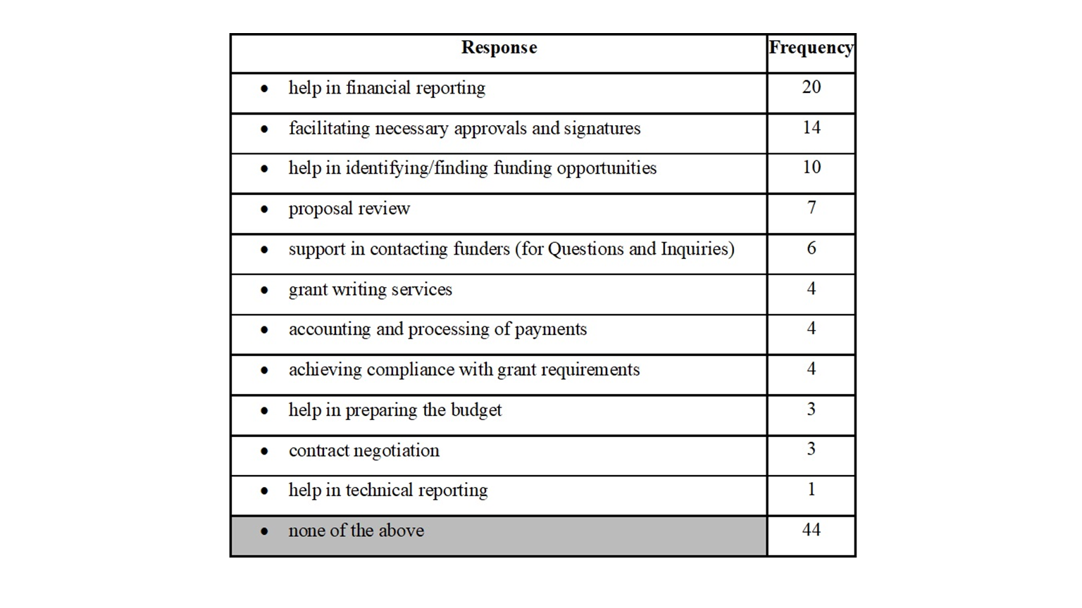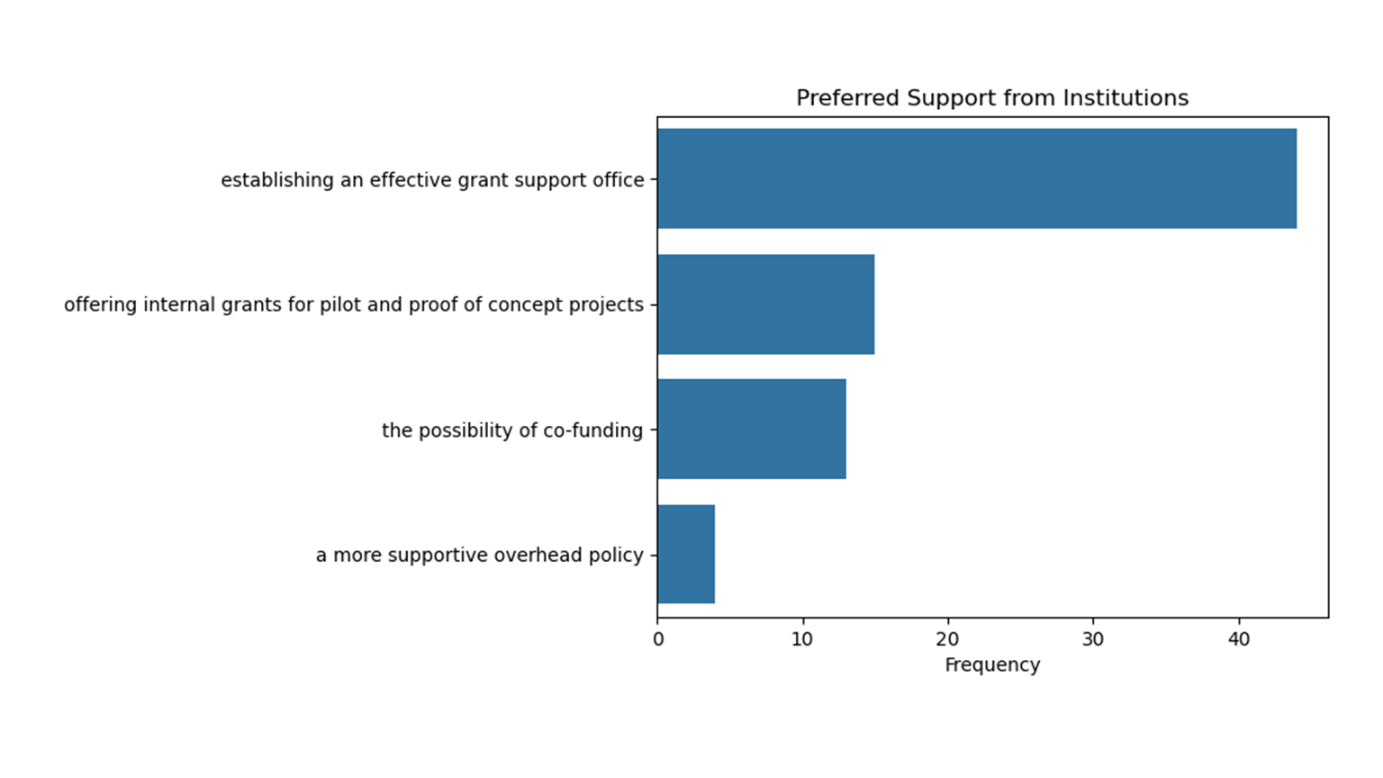 When asked to identify areas where their institutions could provide additional support, the majority of respondents (58%) prioritized the establishment of an effective grant support office. This aligns with the findings of a study by Wedekind and Philbin (2018) which highlighted the role of a university-based structure in providing focused support across the entire grant project lifecycle. This supporting structure was found to act as an advisor or trainer, advising researchers on grant requirements and the feasibility of the project idea.