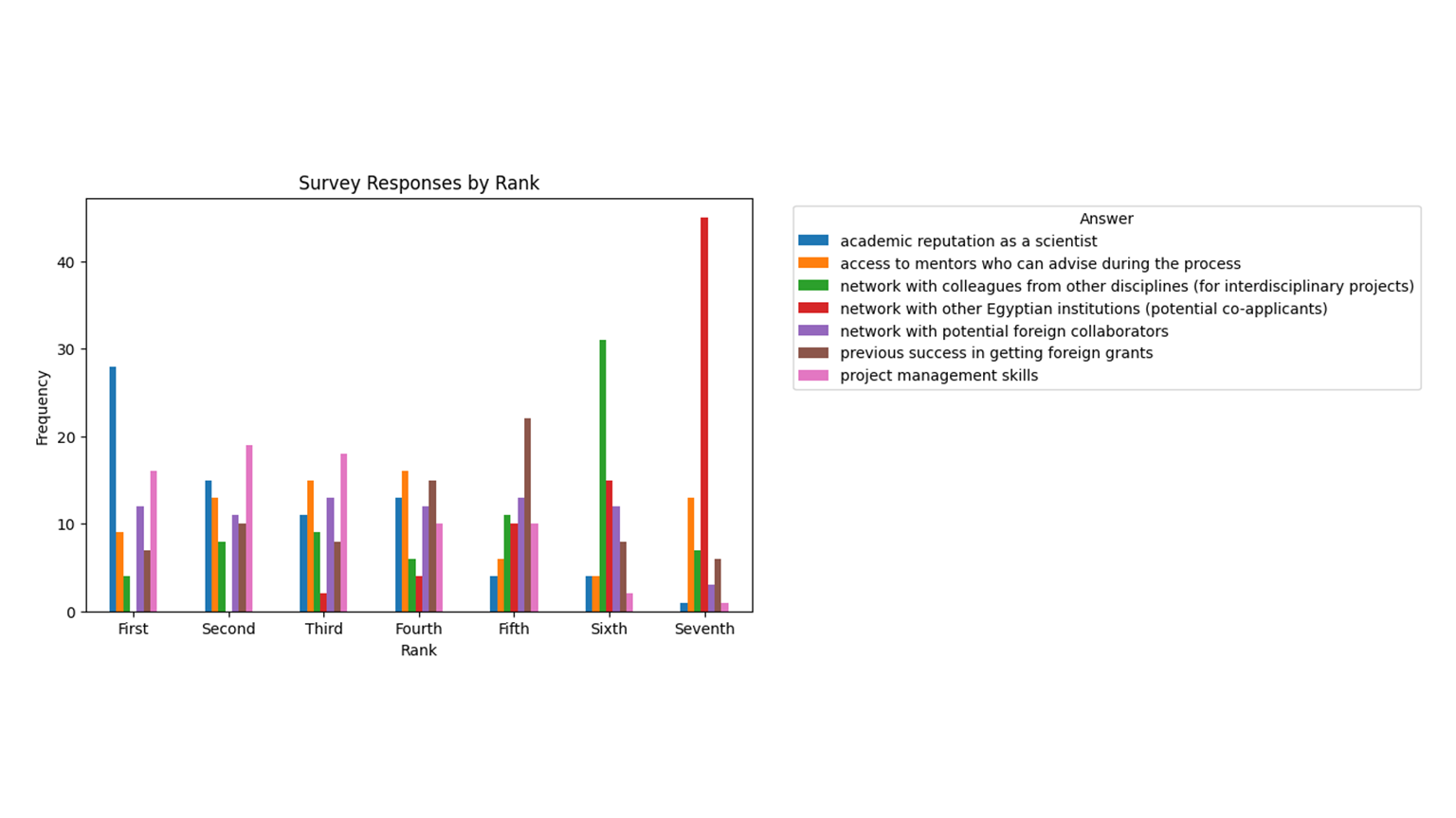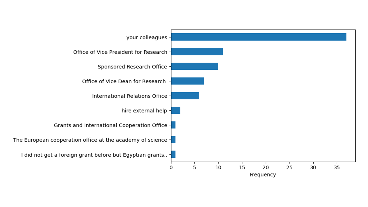 In contrast, a smaller proportion of respondents reported seeking help from institutional entities (collectively 37%) such as the Sponsored Research Office, the Office of the Vice Dean for Research and the International Relations Office. This suggests that while these offices play a role in supporting grant applications, their impact may be less pronounced than the informal support provided by colleagues. In this respect, previous empirical work showed that guided and structured support provided to applicants for grants significantly enhances the success rate of grants (Kulage et al., 2022; Porter 2003), which means there is room for Egypt’s unrealized potential (in EU research funds) to be addressed.