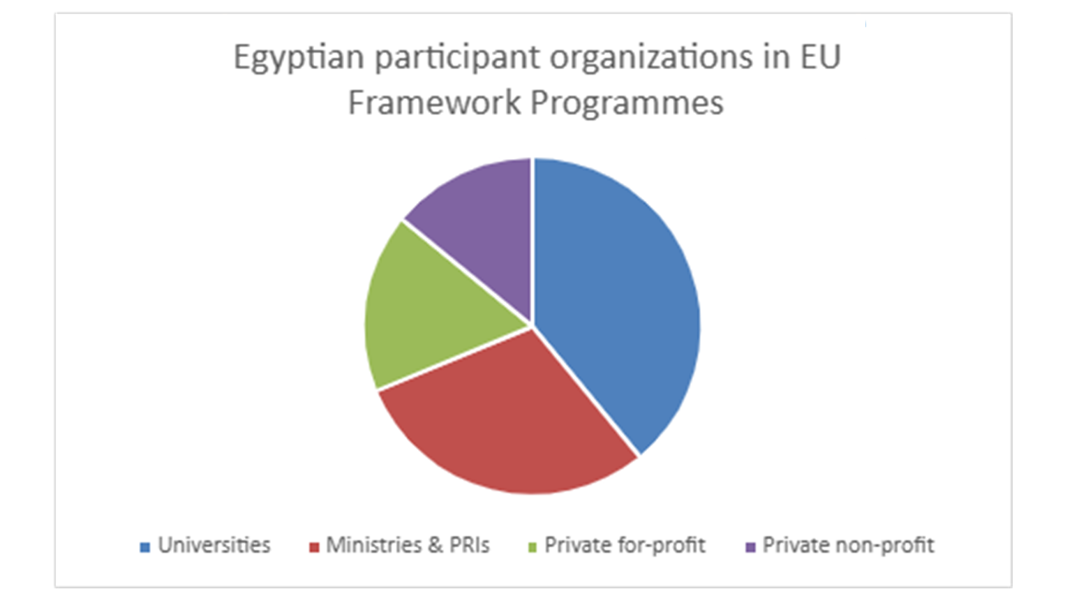 The availability of data through the CORDIS database made it possible to do several studies analyzing the characteristics and impact of EU funding programs (Feld & Kreimer, 2019). In the past, Egypt was known to be among the countries making the most of EU funding opportunities. Analysis by Moskovkin and colleagues show that Morocco, Tunisia and Egypt show 1.5-2.5 times more activity in FP5 than other similar countries in the region (Moskovkin et al., 2009).