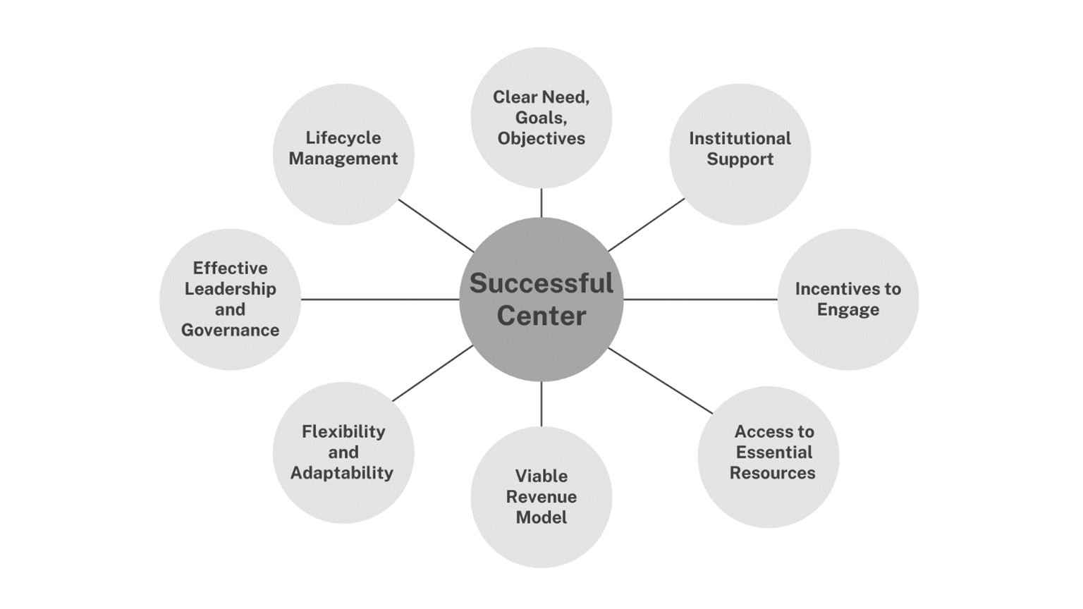Beyond Center-specific investments, institutions should also consider strategic investments that support Centers across the institution, providing appropriate resources at different stages of the individual Center’s lifecycle. Such investments might include strategic planning support, communications support, pre- and post- award support, coaching and mentoring, etc. Such centralized institutional support is far more efficient than every Center self-providing such resources and capabilities. That said, it must be possible for the institutional support to flex with the specific needs of the Center—rigid, uniform approaches simply will not be effective and will constrain the entrepreneurial leadership and energy needed for Center success. Likewise, resource needs will vary with the stage of the Center’s lifecycle. Needed institutional resources at launch will likely look different than institutional resource needs during the growth and maturity stage of the Center.