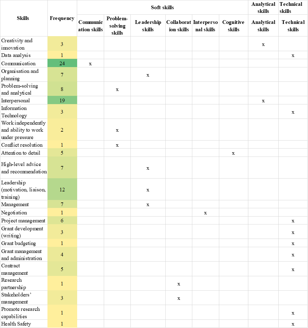 A total of 23 skills (soft and hard skills), mentioned 125 times, were required in all the position descriptions analyzed in this study. The skills were further categorized into communication skills, problem-solving skills, leadership skills, analytical skills, technical skills, collaboration skills, and cognitive skills, as shown in Table 2. Communication (oral and written) was the most frequently mentioned soft skill required for the position of research funding manager, appearing 24 times. Interpersonal skills were the second most required soft skill, while leadership skills were the third most required. Other skills included problem-solving, analytical, management, and organization and planning skills. The top five most required skills were discussed in detail.