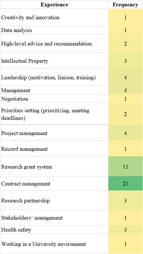 Seventeen areas of experience, mentioned 65 times, were identified. The five most required experiences were grant management and administration (mentioned 21 times), research grant systems (mentioned 11 times), leadership (motivation, liaison, training), management, and project management (each mentioned four times). Only four of the top five most required experiences were discussed in detail, as leadership had already been discussed as a skill (Table 4).