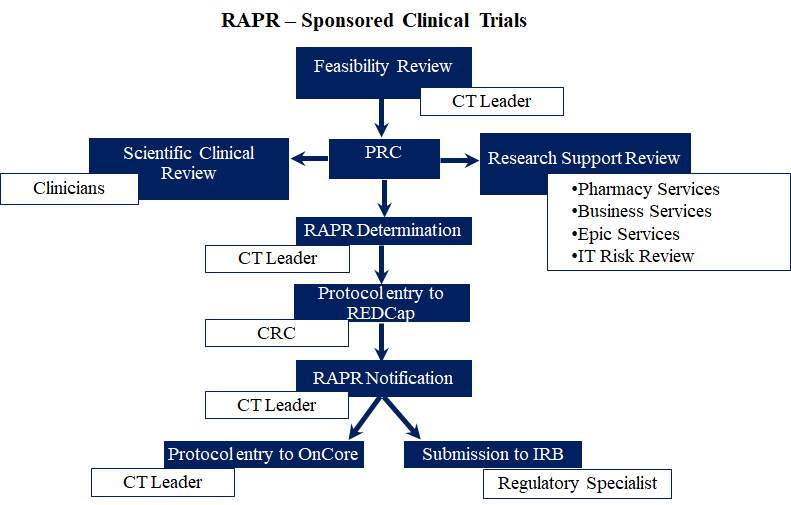 Figure 5. Flowchart depicting the Sponsored Clinical Trials (CT) workflow from study submission to Research Authorization and Protocol Review (RAPR) notification.