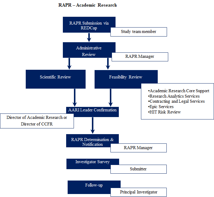 This article outlines the successful implementation of RAPR by AH Midwest. RAPR provides a centralized process for the submission and review of research studies across several research areas; coordinates study reviews in a sequential or parallel manner; serves as a liaison among investigators, reviewers, and research administrators; selects studies that are feasible and meritorious; and provides metrics to enable continuous reassessment and quality improvement. Customization of REDCap has enabled RAPR to develop a robust workflow for tracking study authorization and guiding process improvement.