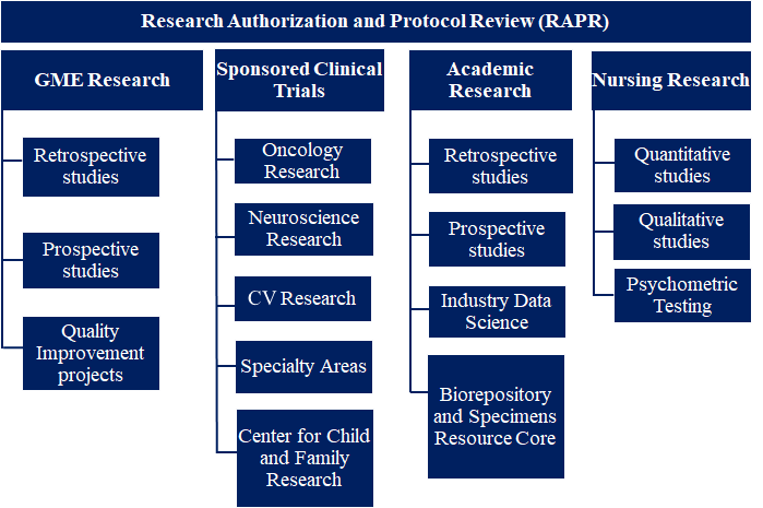 Figure 1. Schematic listing of the areas of Research Authorization and Protocol Review (RAPR) and the types of studies overseen by each area.